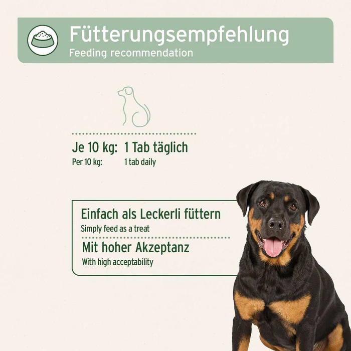 Die Gelenktabletten für Hunde haben eine hohe Akzeptanz und können ganz einfach als Leckerli gefüttert werden. Für kleine Hunde lassen sich die Tabletten zur besseren Fütterung auch in der Mitte teilen. Bei Bedarf kann die tägliche Fütterungsempfehlung auch verdoppelt werden.