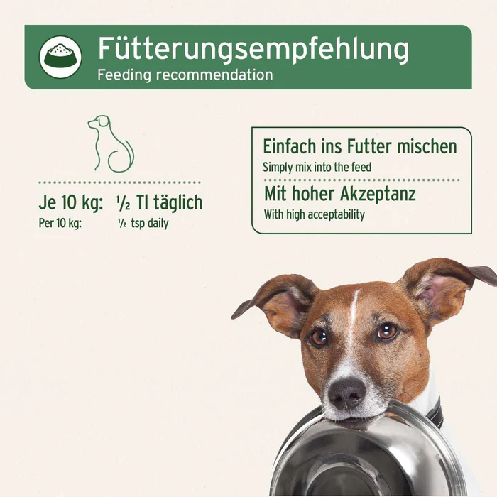 Fütterungsempfehlung: Hunde je 10 kg: 1/2 TL täglich. (1/2 TL entspricht ca. 1 ml)