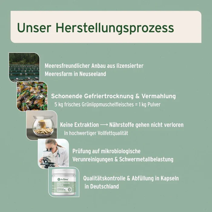 Das in den Kapseln enthaltene Grünlippmuschel Pulver stammt von einer lizensierten Marinefarm aus Neuseeland. Dort werden die Muscheln als Gesamtheit durch schonende Gefriertrocknung weiterverarbeitet – dadurch bleiben die Nährstoffe fast vollständig erhalten. Zudem findet keine Extraktion des gewonnenen Pulvers statt, sodass das Produkt einen Fettgehalt von 10,2 % aufweist - ein hoher Fettgehalt gilt als Qualitätsmerkmal bei Grünlippmuschel Tabletten. Hunde genießen zudem ein Produkt frei von künstlichen Zusätzen, Füllstoffen und Getreide.