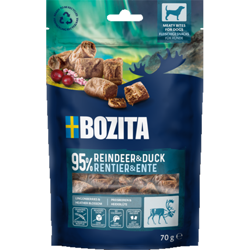Ein getreidefreier Premium-Leckerbissen mit 95 % Rentier und Ente, verfeinert mit einem Hauch von Preiselbeeren und Heideblüten. BozitaMeatyBites sind köstliche Hundesnacks mit einem hohen Fleischanteil, ideal als Belohnung für deinen Hund. Die Snacks sind für alle Rassen und Altersgruppen geeignet. BozitaMeatyBites- ein köstlicher Hundesnack, mit natürlichen Zutaten und aus feinstem Fleisch. Inspiriert von der nordischen Wildnis, gepaartt mit arktischen Beeren für eine natürliche Quelle von Antioxidantien.