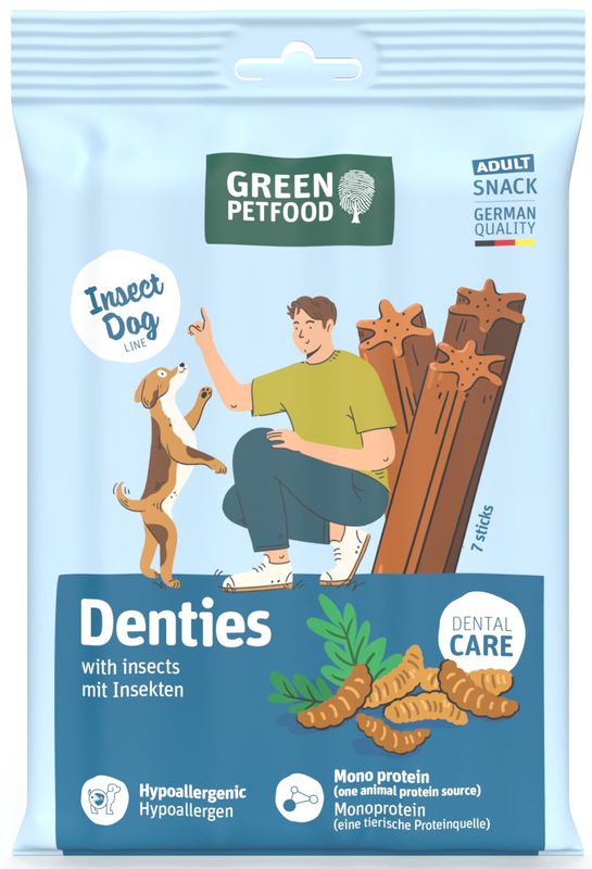 Der Side-Kick des Insekten-Hundefutters: Die hypoallergenen Green Petfood Denties with Insects. Damit unterstützt du die Beißerchen deines Hundes. Wir haben die Dentasticks mit Insektenproteinen gemeinsam mit Ernährungswissenschaftler:innen und Tierärzt:innen entwickelt - in Deutschland und nur mit allerbesten Zutaten.