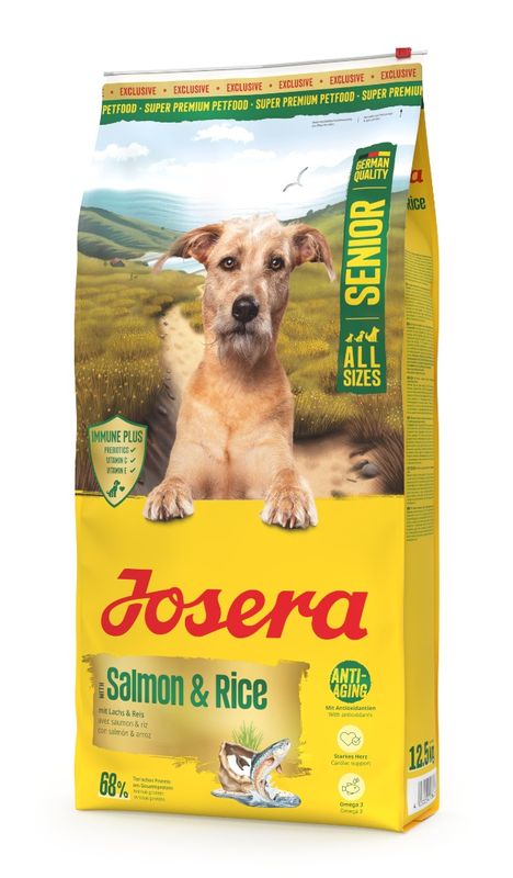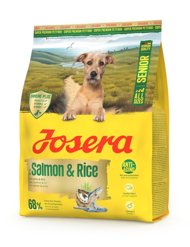 Josera SeniorPlus heißt jetzt Senior Salmon & Rice: Mit dem neuen Design wird die bewährte Rezeptur um IMMUNE PLUS ergänzt.