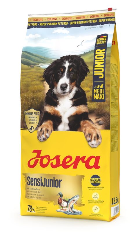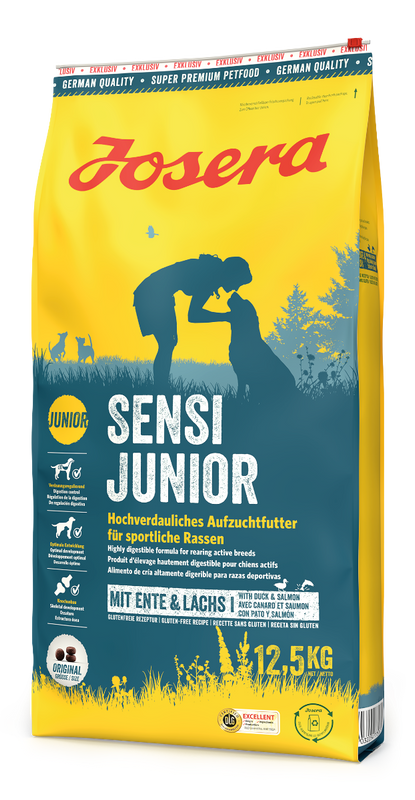 Aktive Welpen haben ganz besondere Ansprüche – und JoseraSensiJunior mit Lachs, Ente sowie Reis geht perfekt auf diese ein! Das sensitive Welpenfutter mit glutenfreier Rezeptur für mittlere und große Rassen ist proteinreich und fördert durch das ausgewogene Calcium-Phosphor-Verhältnis, Vitamin C, Mangan und Kupfer einen gesunden Knochenbau sowie eine optimale Entwicklung.