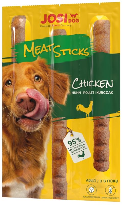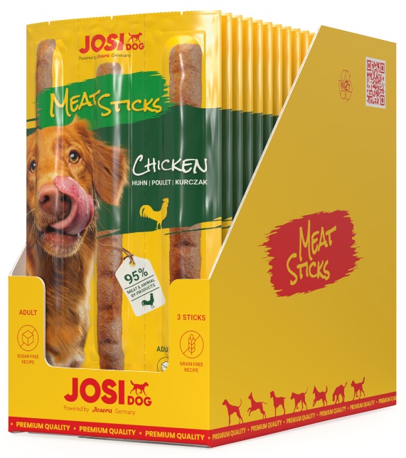 Der hohe Fleischanteil macht unsere Meat Sticks zu den absoluten Lieblingssnacks für ausgewachsene Hunde. Die praktische Verpackung enthält 3 einzeln versiegelte JosiDog Meat Sticks und ist auch super für unterwegs geeignet.