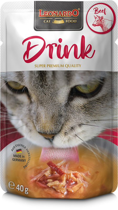 Die Katze als Wüstentier nimmt Flüssigkeit, wenn möglich, vor allem durch Beutetiere auf. Sie trinkt von Natur aus sehr wenig und verspürt selten Durst. Leitungswasser ist zudem oft einfach nicht verlockend genug. Gerade bei Hauskatzen kann dies jedoch zu einem Flüssigkeitsmangel führen. LEONARDO® Drinks animieren durch den außergewöhnlichen Fleischgeschmack zum Trinken. Eine ausreichend hohe Flüssigkeitsaufnahme unterstützt die Funktion der Harnwege.