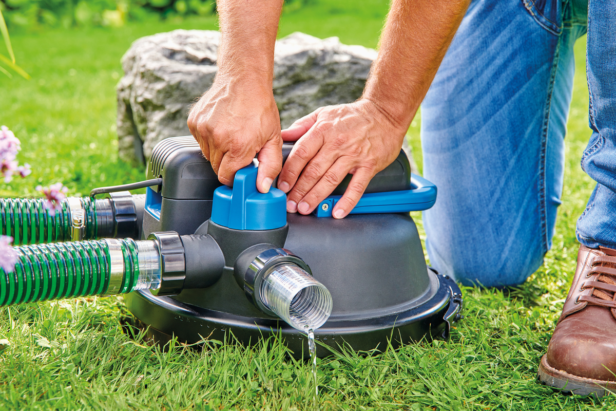 Über das 2-Wege-Ventil wird das Schmutzwasser aus den gereinigten Filterschwämmen zum Beispiel ins Blumenbeet abgelassen.