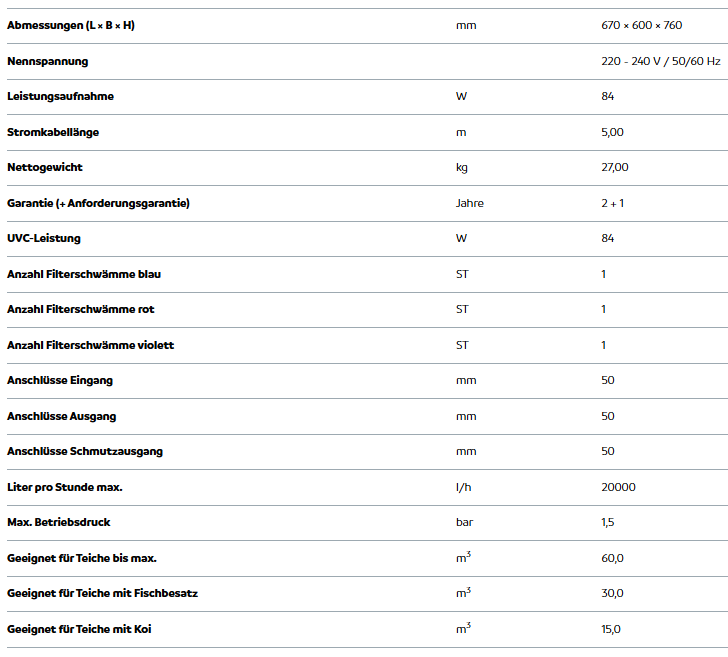 Druckfilter mit UVC und patentierter Reinigungsfunktion für Teiche bis 60 m³.