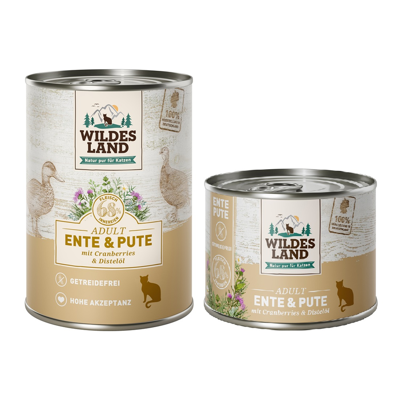 Für das Wohlbefinden Ihrer Katze ist eine ausgewogene Ernährung mit hochwertigen Proteinen unerlässlich. Das Nassfutter von Wildes Land basiert auf der Ursprünglichkeit und Kraft der Natur. Deshalb enthält die Sorte Ente &, Pute von Wildes Land kein Getreide und nur hochwertige Proteinquellen sowie Cranberries für eine artgerechte Ernährung. Mit einem Gesamtanteil an Muskelfleisch und Innereien von mehr als 68 % besitzt es eine ausgezeichnete Akzeptanz und Verträglichkeit. Ergänzt wird die Rezeptur nur mit ausgewählten Cranberries und wertvollem Distelöl - kombiniert nach den neuesten wissenschaftlichen Erkenntnissen. Mit dem Wildes Land Nassfutter Ente &, Pute wird Ihre Katze mit allen wichtigen Nährstoffen und Vitaminen versorgt, die sie für ein langes, aktives Leben braucht.