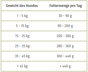 Die angegebene Menge dient nur der Orientierung. Die Futtermenge muss entsprechend dem Alter, der Rasse und der Beanspruchung angepasst werden. Ihr Hund sollte stets frisches Wasser zur Verfügung haben.