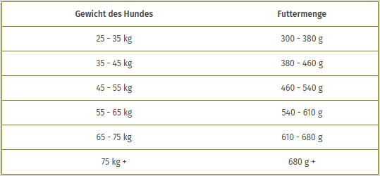 Die angegebene Menge dient nur der Orientierung. Die Futtermenge muss entsprechend den individuellen Bedürfnissen des Hundes angepasst werden. Jeder Hund ist anders und seine optimale Fütterungsmenge hängt von verschiedenen Faktoren ab, wie Alter, Geschlecht, Aktivität, Stoffwechsel und Umwelteinflüssen. Ihr Hund sollte stets frisches Wasser zur Verfügung haben.