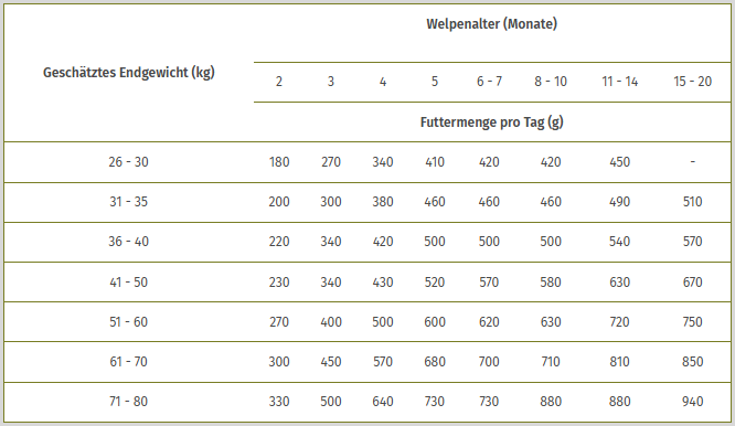 Die angegeben Menge dient nur der Orientierung. Die Futtermenge muss entsprechend dem Alter, der Rasse, der Beanspruchung Ihres Hundes und den klimatischen Bedingungen angepasst werden. Trächtige Hündinnen haben einen erhöhten Nährstoffbedarf. Während der ersten 6 Wochen der Trächtigkeit ist die Futtermenge um 25 % zu erhöhen. In der 7-9 Woche steigt der Bedarf auf bis zu 75 % zusätzlich. Idealerweise sollte diese Menge auf 2-3 Mahlzeiten verteilt werden. Ihr Hund sollte stets frisches Wasser zur Verfügung haben.