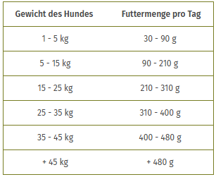 Die angegebene Menge dient nur der Orientierung. Die Futtermenge muss entsprechend dem Alter, der Rasse und der Beanspruchung angepasst werden. Ihr Hund sollte stets frisches Wasser zur Verfügung haben.