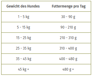 Die angegebene Menge dient nur der Orientierung. Die Futtermenge muss entsprechend dem Alter, der Rasse und der Beanspruchung angepasst werden. Ihr Hund sollte stets frisches Wasser zur Verfügung haben.