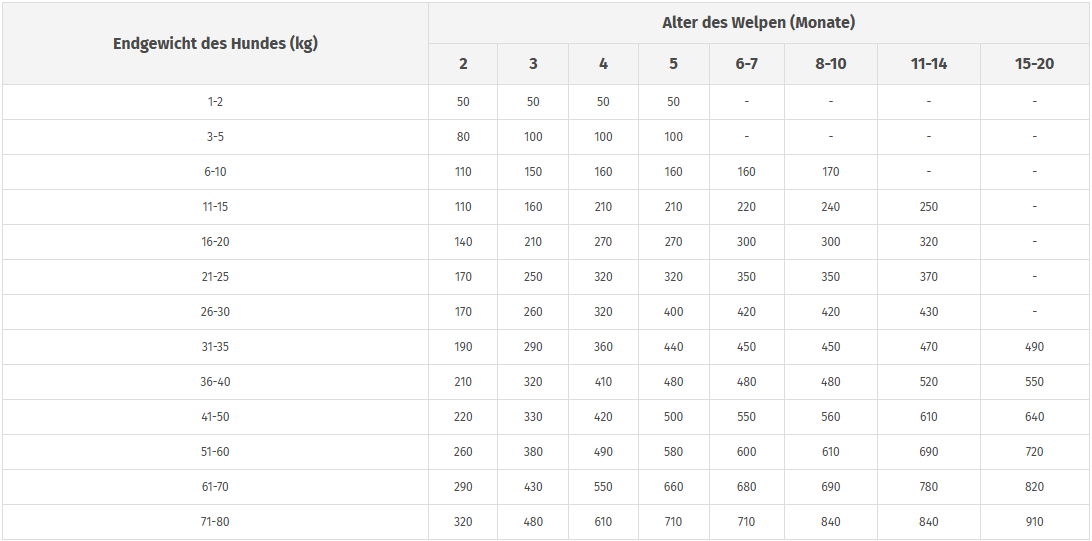 ACHTUNG: Die Fütterungstabelle wurde angepasst, sodass die Angaben nun in Monaten und nicht mehr in Wochen erfolgen, analog zu den von FEDIAF und den neuesten wissenschaftlichen Erkenntnissen empfohlenen Entwicklungsphasen der Welpen.