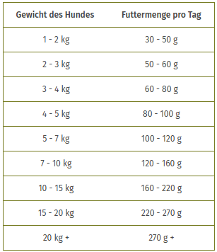 Die angegebene Menge dient nur der Orientierung. Die Futtermenge muss entsprechend dem Alter, der Rasse und der Beanspruchung angepasst werden. Ihr Hund sollte stets frisches Wasser zur Verfügung haben.