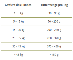 Die angegebene Menge dient nur der Orientierung. Die Futtermenge muss entsprechend dem Alter, der Rasse und der Beanspruchung angepasst werden. Ihr Hund sollte stets frisches Wasser zur Verfügung haben.
