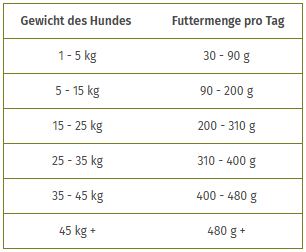 Die angegebene Menge dient nur der Orientierung. Die Futtermenge muss entsprechend dem Alter, der Rasse und der Beanspruchung angepasst werden. Ihr Hund sollte stets frisches Wasser zur Verfügung haben.