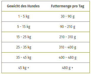 Die angegebene Menge dient nur der Orientierung. Die Futtermenge muss entsprechend dem Alter, der Rasse und der Beanspruchung angepasst werden. Ihr Hund sollte stets frisches Wasser zur Verfügung haben.