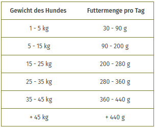 Die angegebene Menge dient nur der Orientierung. Die Futtermenge muss entsprechend dem Alter, der Rasse und der Beanspruchung angepasst werden. Ihr Hund sollte stets frisches Wasser zur Verfügung haben.