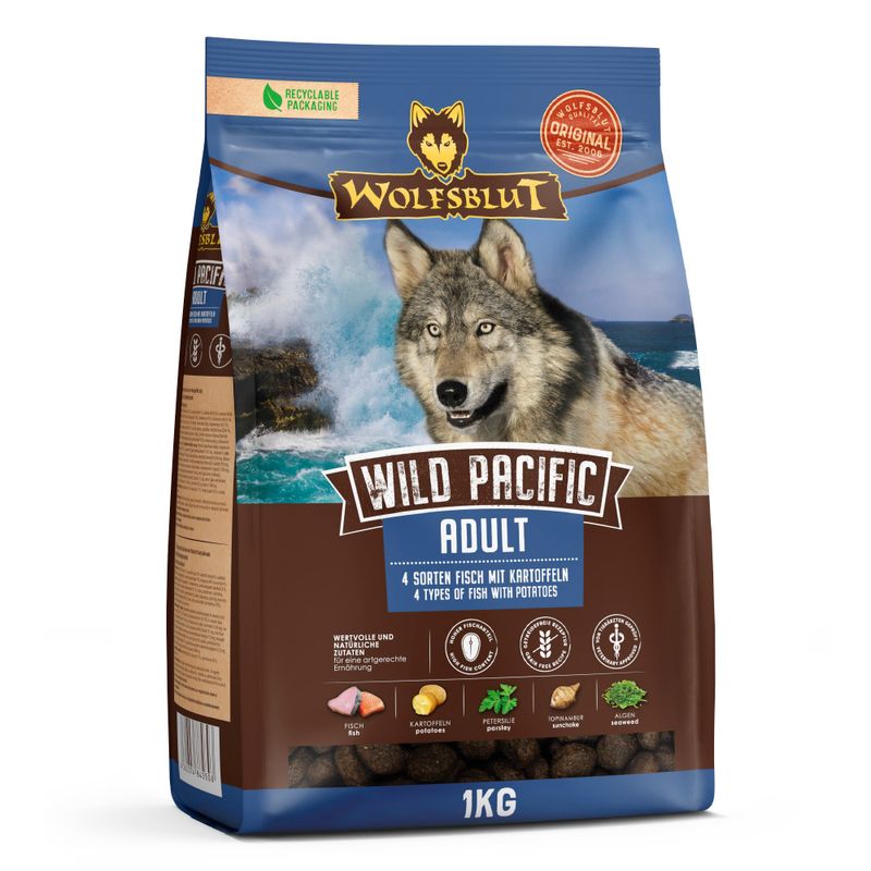 In den Rocky Mountains Nordamerikas, der arktischen Tundra, den Bergen und Wäldern Europas bis hin zu den Wüsten und Steppen Zentralasiens jagen Wölfe ihre Beute. Diese versorgt sie mit Fleisch und nährstoffreichen Innereien, aber auch mit Gemüse, Früchten, Beeren, Wurzeln und Kräutern über den Mageninhalt der Beute. Getreide gehört hier nicht dazu. So erhält der Wolf seine benötigten Vitamine, Mineralstoffe, Spurenelemente, Enzyme und sekundären Pflanzenstoffe. Da der Wolf der Urahn aller Hunde ist, orientiert sich unser Wolfsblut Hundetrockenfutter an diesen natürlichen Fressgewohnheiten des Wolfs. Es enthält viel Fleisch oder Fisch kombiniert mit Superfoods, die wertvolle Inhaltsstoffe enthalten – und das wie in der Natur, ganz ohne Getreide. Unsere Auswahl an außergewöhnlichen Fleischsorten und nährstoffreichen Superfoods baut dabei auf den Lebensräumen des Wolfs und deren bunter Nahrungsvielfalt auf. Wolfsblut bietet jedem Hund eine artgerechte und ursprüngliche Ernährung und mit seiner Sortenvielfalt ist für jeden etwas dabei, das er verträgt. Die Rezeptur von WILD PACIFIC Trockenfutter verbindet die Nahrung des Wolfs mit den neuesten wissenschaftlichen Erkenntnissen über richtige Hundeernährung.